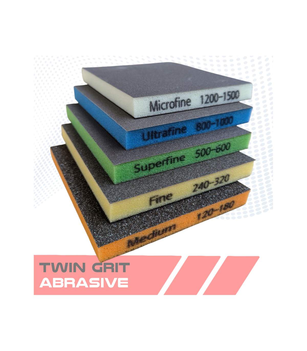 Stardust TWIN GRIT abrasive sponges can be used for wet sanding, to prevent clogging and overheating, or for dry sanding. They can be used many times and can be washed.