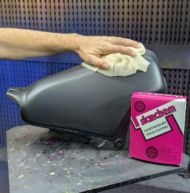 Sticky wipes are used to remove any remaining dust before applying varnish to a car bodywork.