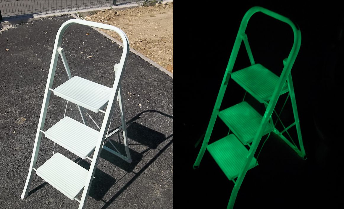 It's water and oil proof, resists perfectly to acids, bad weather conditions and to heat up to 180°C and has a lifetime of 20 years. It adheres very well on many types of supports such as wood, concrete, metals, stones,... 3 to 4 coats allow a very good luminescence, after 30 to 60min of charge, and it will glow during 12h in complete darkness.
